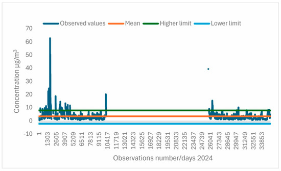 During the year 2024, the concentration of half of the PM2.5 performed showed concentrations below 2.48 µg/m3. A kurtosis equal to 85.31 µg/m3 indicates a distribution with very long tails, that is, there are rare events of concentrations with high values. Most PM2.5 is at low levels, but there are sporadic events of high concentration, which justifies the high kurtosis.