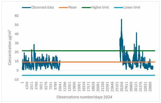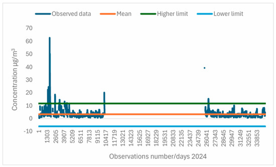 After accessing the Air Quality Monitoring Portal in the Autonomous Region of the Azores (PMQA) [37] and reviewing the dates of PM2.5 and PM10 exceedance alerts, moderate and severe outliers were identified in the 2024 time series of particulate matter, SO2, and O3. For some exceedance periods, Pearson’s correlation coefficients were calculated between the parameters studied.