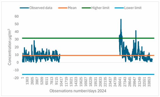 A standard deviation equal to 6.83 µg/m3 indicates that the values obtained for the PM10 time series have greater variability than the values analyzed in the PM2.5 series. A kurtosis value of 6.08 µg/m3 suggests that PM10 particulate matter has a slightly asymmetric distribution with some extreme measurements. The PM10 time series shows greater variation than the PM2.5 time series, indicating more pronounced pollution episodes, but within generally low limits.