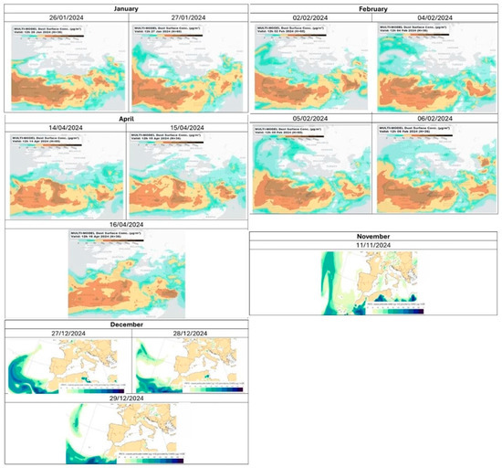 The episodic peaks observed in PM10 concentrations are closely aligned with documented Saharan dust intrusion events, notably during November and December 2024, as demonstrated in Figure 11. These maps confirm that air masses carrying high concentrations of mineral dust frequently reach the Azores from North Africa. This reinforces the transboundary character of particulate pollution in the region, with potential implications for public health and ecosystem integrity. This highlights the importance of integrating satellite-based dust transport models into local air quality forecasting systems and supports the development of early warning mechanisms tailored to island territories, which are often underrepresented in continental-scale environmental monitoring and policy frameworks.