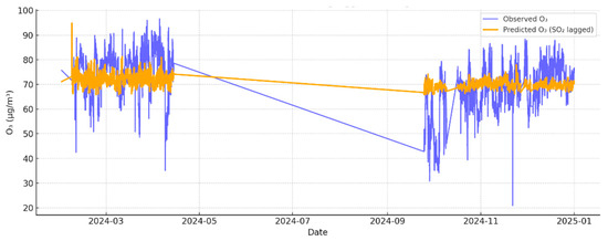 The weak correlations observed between atmospheric particulate matter (PM2.5 and PM10) and trace gases (SO2 and O3) are not anomalous in environmental studies; rather, they reflect the multifactorial nature of atmospheric chemistry and transport mechanisms in insular environments such as the Azores. Although statistically significant relationships were identified such as the positive time-lagged association between SO2 and O3 (Pearson = 0.237, Spearman = 0.289) the low coefficients of determination (R2 = 0.056 for O3 predicted by lagged SO2, and R2 = 0.002 for SO2 predicted by lagged PM2.5) underscore the limited explanatory power of these simple linear models.