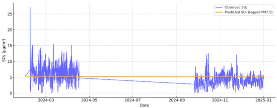While statistically significant correlations were found between SO2 and O3 (with a +3 h lag), and between SO2 and PM2.5 (with a −6 h lag), the low explanatory power of these linear models (R2 = 5.6% and R2 = 0.2%, respectively) suggests that simple bivariate analyses are insufficient to capture the complexity of atmospheric interactions in this region. Future studies should explore nonlinear and multivariate models incorporating meteorological and chemical variables to better understand pollutant behavior.