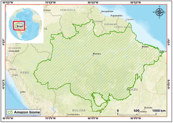 The study area considered in this research corresponds to the legal boundaries of the Amazon biome in Brazil, as defined by the Brazilian Ministry of the Environment and adopted by the MapBiomas Project. This area was delineated using official cartographic bases and geospatial datasets, allowing precise extraction of land cover and hydrological variables at the biome scale. The Amazon is characterized by a humid equatorial climate, with mean annual temperatures ranging from 24 °C to 27 °C and annual rainfall between 1700 and 3600 mm [43]. Its hydrological network is dominated by the Amazon River and its tributaries, forming one of the world’s most extensive and dynamic freshwater systems [44]. Despite predominantly acidic and nutrient-poor soils, the biome supports high primary productivity, vast stores of arable land, mineral resources, and about 20% of the global supply of surface freshwater [45,46].