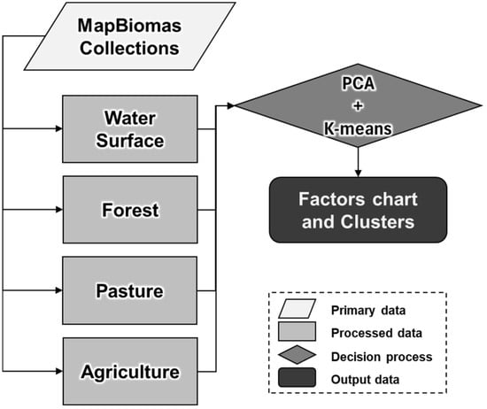 Subsequently, K-means cluster analysis was conducted on the principal component scores to group years with similar land cover dynamics. The optimal number of clusters was determined using the Elbow method, which identifies the point at which increasing the number of clusters yields diminishing returns in explained variance [55,56,57,58]. Analyses were performed in Python (Spyder 6.0.7, Anaconda distribution), ensuring reproducibility. Both PCA and K-means clustering are well-suited to summarize multivariate environmental time series without requiring distributional assumptions or external prediction [58]. All steps were validated for statistical adequacy and robustness, providing a solid foundation for subsequent interpretation of Amazonian land-water cover trajectories. Figure 2 below provides a flowchart of all the analyzed methods used in this study.