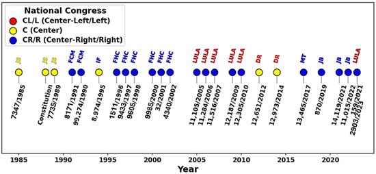 Initially, a comprehensive survey of Brazilian environmental policies, both historical and current, was performed. All relevant legislative acts and policy instruments were cataloged in chronological order, and their periods of validity were systematically cross-referenced with observed environmental trends during the years analyzed in this study. The political-ideological orientation of the executive and legislative branches was determined using established classifications from Bolognesi et al. [47]; Power and Zucco Jr [48]; Zucco and Power [49].