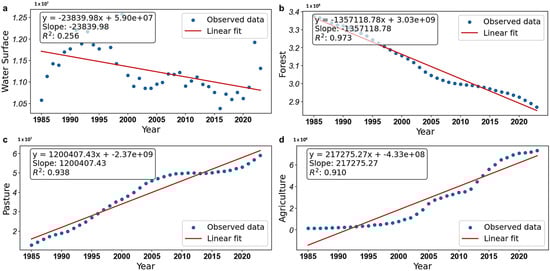 Trend fit: (a) Water Surface, (b) Forest, (c) Pasture, and (d) Agriculture. The X-axis represents years, and the Y-axis shows area in hectares (ha). The pronounced variability observed in water surface area reflects the Amazon’s natural flood pulse regime, further influenced by climate extreme events, as well as changes in land use.