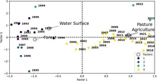 Cluster 4 (yellow), spanning 2000–2021, dominates the right side of the graph, in the positive region of Factor 1, and is strongly associated with “Pasture” and “Agriculture.” This group encompasses the years when anthropogenic land uses became predominant, showing the progressive replacement of forest and water bodies by agricultural and pasture expansion. The most recent years (especially 2016–2021) confirm the intensification of this process, with a clear trend of land conversion.