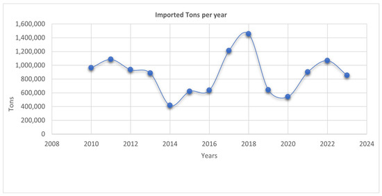 During the period 2010–2023, 7,401,594 tons of coke were imported through the port of Veracruz, with peaks in the years 2011, 2018, and 2022. These increases coincide with increased activity in the domestic steel industry (Table 2). Imports were distributed in 593 port operations with an average of 570 tons per year. This growth in coke handling coincides with the increase in PM10 particulate matter emissions observed in the years with the largest operations [18].