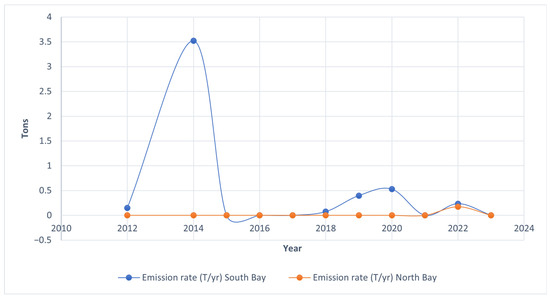 The maximum extent of storage in the South Bay in 2014 (14,000 m2) coincided with the highest calculated emission rates (3.52 tons/year), demonstrating a direct relationship between the exposed surface area and the magnitude of emissions. Previous studies in ports with similar climates have indicated that specific conditions, such as wind speeds greater than 4.5 m/s and temperatures above 30 °C, exacerbate particle dispersion [7,21]. This pattern was evident in Veracruz, especially in high import years such as 2014 and 2020. However, the partial confinement implemented in the North Bay mitigated this impact.