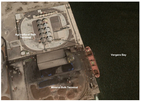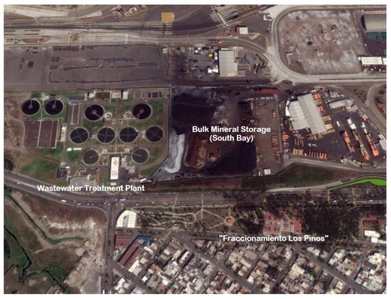Using the Google Earth Tool, it was determined that there are two different storage areas for Bulk Ore (Coke) in the Veracruz Port Terminal facilities, the first (Figure 4) is located in the South Bay Port Terminal, located next to the North Wastewater Treatment Plant and close to the Los Pinos Development, and the specialized Bulk Ore Terminal (Figure 4) is located in the New Port of Veracruz in Vergara Bay.