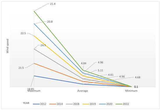 The following data were considered for the study: wind speeds within the range of ≤5.5 m/s, and an average temperature ≥ 29 °C depending on the year. These data were taken from historical data published by Meteoblue, this information can be seen in Figure 8, where we can observe wind behavior within the annual study ranges. A stacked line graph shows the maximum and minimum winds, along with the average calculated from these two data points. This is based on the data available in Meteoblue.