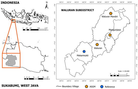 Artisanal and small-scale gold mining in West Java is mostly centered in Gunung Pongkor, Tasikmalaya, and Sukabumi, while expert gold processors also operate in other parts of Indonesia. Despite the implementation of the 2020 Governor’s Regulation on Hg Reduction, Hg use in the ASGM sector remains significant, with the chemical being widely available at local kiosks [3]. The Waluran Subdistrict in southern Sukabumi, West Java, is a hotspot for illegal ASGM. The region’s gold-rich geology has attracted unregulated mining, with over 35 shafts, some deeper than 100 m, operating without environmental controls. Mercury-based amalgamation is commonly used, leading to serious Hg contamination of water, soil, and plants [6]. On the other hand, Waluran’s economy remains predominantly agricultural, with 78% of its population engaged in farming [7]. The subdistrict is a recognized producer of rice and cassava, with a strong presence of farmer cooperatives and small agro-industries. Waluran cultivated 10 hectares of cassava with a productivity of 260.76 quintals per hectare, resulting in a total yield of 260.76 tons, the highest productivity rate among neighboring subdistricts [8]. Notably, the Waluran subdistrict is home to several cassava-processing groups that produce traditional snacks such as “Keripik Enye”, which support local livelihoods and empower rural women.