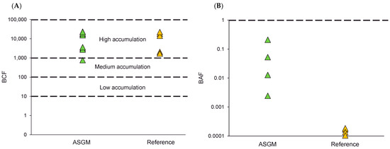 BCF of Hg in fish (A) and BAF of Hg in cassava root (B).
