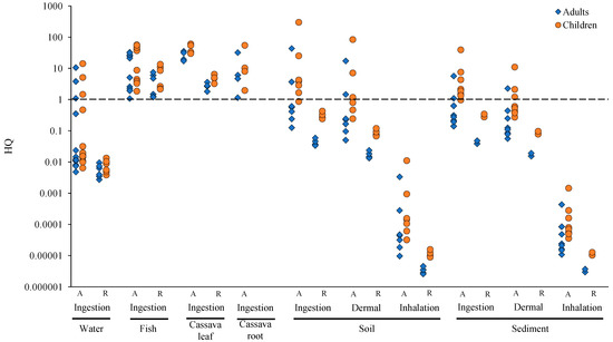 where CDIing is CDI via ingestion, CDIinh is CDI via inhalation, and CDIder is CDI via dermal. The ingestion rate of water and fish, as well as cassava consumption, were used to calculate CDI for HQ and obtained directly from household surveys conducted among residents.