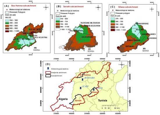 Location of the study area: (A) Bou Hertma subcatchment, (B) Sarrath subcatchment, (C) Siliana subcatchment, and (D) Medjerda catchment.