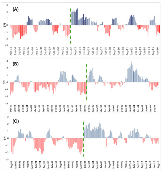 Time courses of Standardized Precipitation Indices: (A) Bou Hertma subcatchment, (B) Sarrath subcatchment, and (C) Siliana subcatchment. The red and blue bars correspond respectively to the positive and negative values of SPI, and the green line indicates the breakpoints.