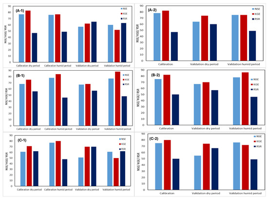 Calibration for model performance in non-stationary climate conditions: (A) Bou Hertma subcatchment, (B) Sarrath subcatchment, and (C) Siliana subcatchment.