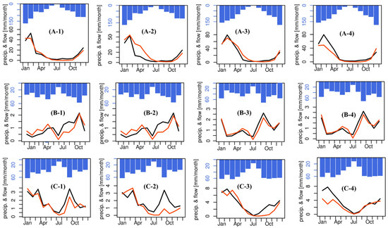 Model performance evaluation of flow and precipitation regimes for the studied subcatchments: (A) Bou Hertma, (B) Sarrath, and (C) Siliana. The numerical designation following each configuration indicates the following: 1 and 2 correspond to calibration and validation during the dry period, respectively, while panels 3 and 4 represent calibration and validation during the humid period, respectively. The black and red lines correspond respectively to the monthly observed and simulated flow, and the blue bars represent the monthly precipitation.