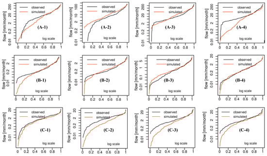 Flow Duration Curves (FDCs) for observed and simulated monthly flow under log scale for the studied subcatchments: (A) Bou Hertma, (B) Sarrath, and (C) Siliana. The numerical designation following each configuration indicates the following: 1 and 2 correspond to calibration and validation during the dry period, respectively, while 3 and 4 represent calibration and validation during the humid period, respectively.