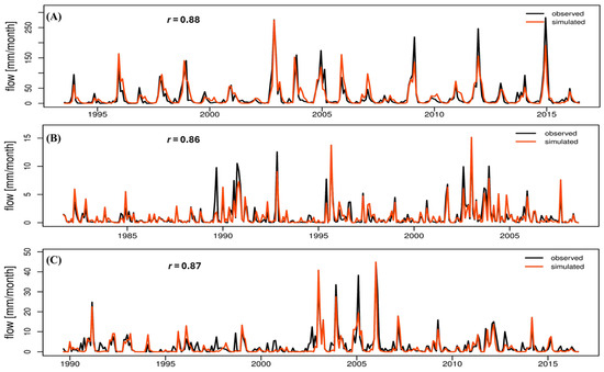 where Qobs corresponds to the observed discharge values [mm/month], Qsim corresponds to the modeled discharge values at time or location [mm/month], and and are the mean of observed and simulated monthly values, respectively [mm/month]. Nash–Sutcliffe values could range from −∞ to < 100. An NSE equal to 100 indicated a perfect correspondence between the simulated values and the observations; the model was more accurate for an NSE close to 100.