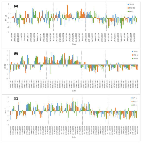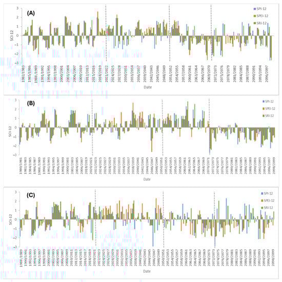The increasing vulnerability of drought regimes to climate change is a significant challenge. Drought forecasting is, therefore, crucial for optimizing water resource management [48]. In this research study, the standardized climate indices (SCIs) were used, consisting of the Standardized Precipitation Index (SPI) and the Standardized Precipitation–Evapotranspiration Index (SPEI) to assess meteorological drought and the Standardized Runoff Index (SRI) to assess hydrological drought.