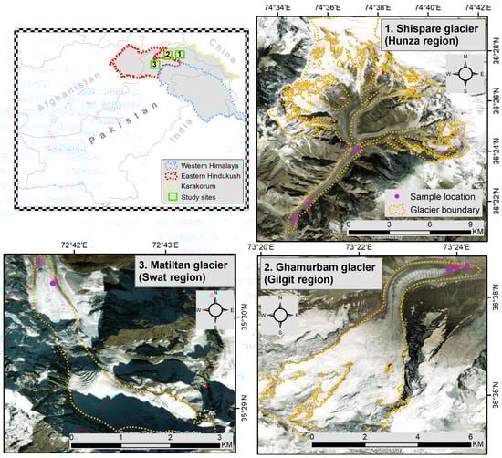 Geographical map of the sampling locations from HKH region in Pakistan. The numbers, i.e., 1, 2 and 3, represent three different glaciers sampled in this work. Pink dots represent the sampling locations in the glaciers’ surfaces. For panel ‘3. Matiltan glacier (Swat region)’, each dot represents three different locations which were geographically indistinguishable (though 10–15 m away from each other).