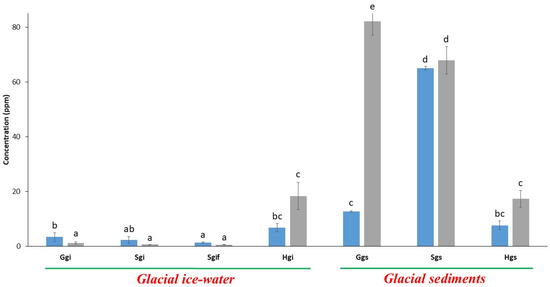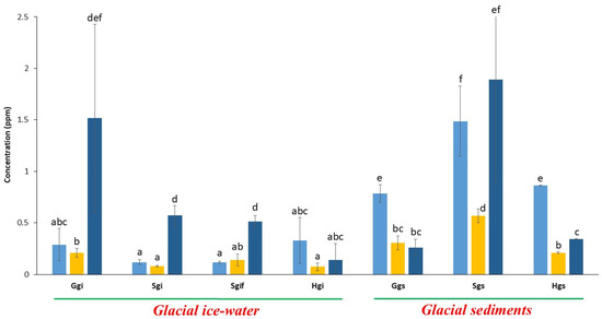 In contrast, cadmium (Cd) showed a reversed pattern, with significantly higher concentrations in Ghamurbam glacier ice (Ggi, 0.31 ppm) than in its corresponding sediment sample (0.09 ppm, p < 0.05). This anomalous distribution may reflect differences in Cd mobility or solubility in glacial environments (Figure 4b).