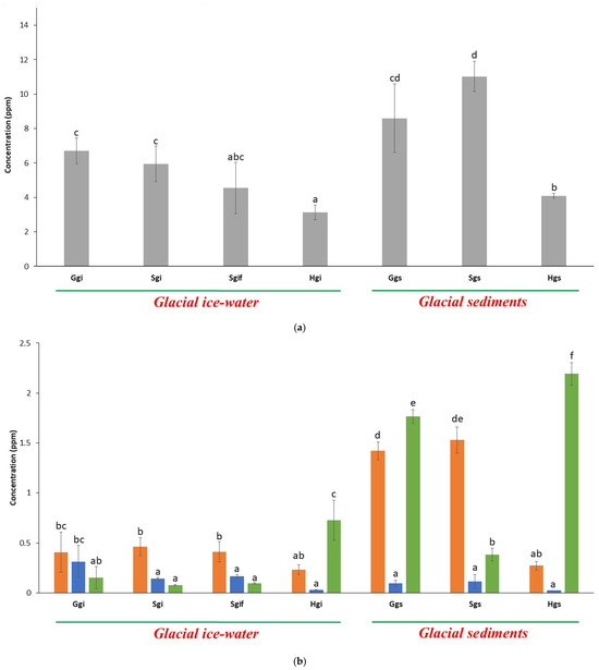 Potassium (K) and iron (Fe) are essential elements found in Earth’s crust and are vital for biological processes. In this study, we observed that these elements were present in relatively small amounts within the glacial ice samples (Ggi, Sgi, Sgif), with Fe up to 1.25 ppm and K up to 3.42 ppm (Figure 2). However, the Shispar glacier ice (Hgi) exhibited significantly higher concentrations of Fe (18.4 ppm, p < 0.01) and K (6.8 ppm, p < 0.05) compared to other ice-water samples.