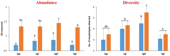 Evaluation of cultivable bacterial growth (abundance and diversity) in two temperature conditions (4–8 °C, blue bars and 12–18 °C, orange bars) for the ice-water samples originating from HKH glaciers. Error bars in the graph represent standard deviations, where n = 3, while letters, i.e., abc, indicate different statistical classes.