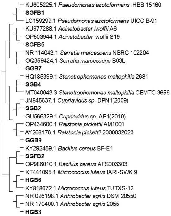 Another important group included SGB2, which was related to Cupriavidus sp. (bootstrap = 94%), a genus known for its capacity to survive in polluted environments by detoxifying heavy metals. Additionally, GGB9 and SGFB2 were closely aligned with Bacillus cereus (bootstrap = 99%), a widely studied bacterium that thrives in extreme environments and is involved in nutrient cycling and metal resistance. The isolate HGB6 showed genetic alignment with Micrococcus luteus (bootstrap = 95%), an extremophile bacterium known for its resilience in harsh environments. Lastly, HGB3 clustered with Arthrobacter agilis (bootstrap = 93%), a species typically found in heavy metal-contaminated soils, suggesting its potential role in biogeochemical cycling.