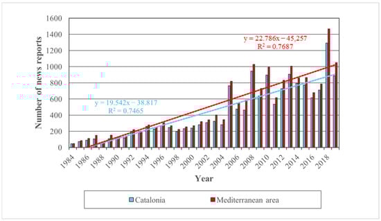 Figure 1 shows the annual evolution of the news reports on hydrometeorological events within the Mediterranean region (including Catalonia) and specifically in Catalonia.