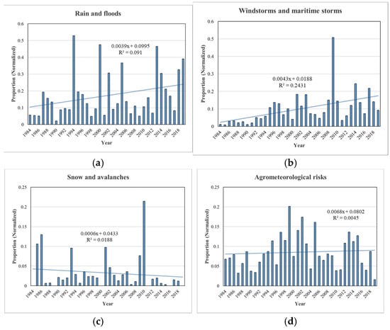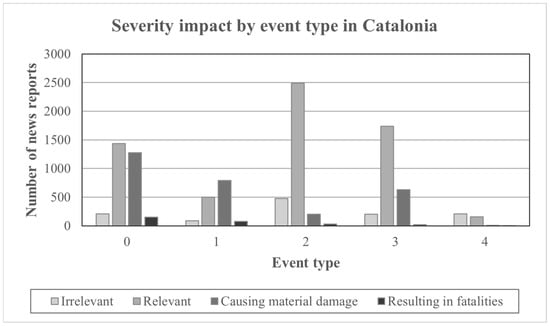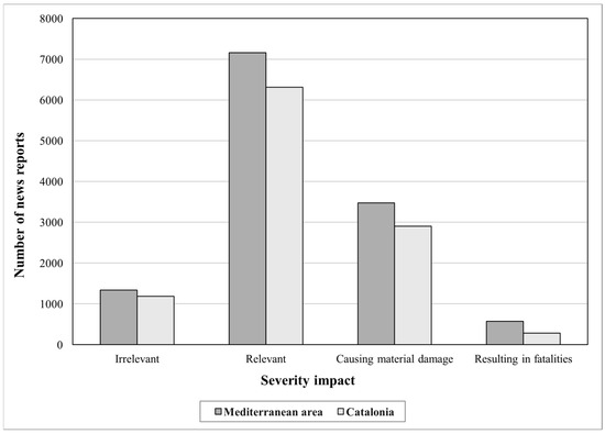 The distribution of the news reports according to the type of meteorological event in Catalonia and the broader Mediterranean region between 1984 and 2019 is shown in Figure 2. Figure 3 presents the annual number of news reports classified by their level of impact for the same period and regions.
