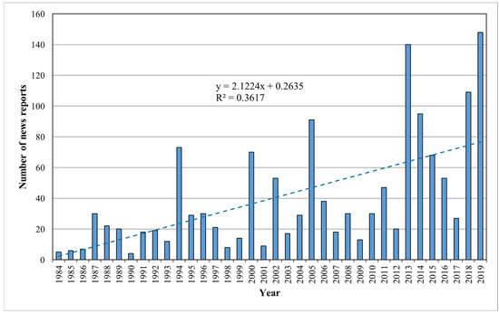 Statistical data showing annual distribution of news reports by type of phenomenon during 1984–2019 period.