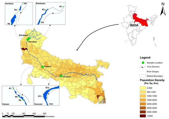 Rishikesh is a holy place that is in the state of Uttarakhand, northwest India. It is densely surrounded by the Himalayan Mountains on three sides and has the holy River Ganges flowing through it. There are towns and settlements on both sides of the river. For more than a century, Rishikesh has been a pilgrimage destination central to Hinduism. Rishikesh has a population of approximately 8000 [59], with several thousand pilgrims and tourists visiting the city each month. Haridwar is situated on the bank of the Ganges River, and it has a population of approximately 1.8 million [60]. It is a prominent site of pilgrimage for Hindus and is well known for its temples and ghats, where devotees bathe to atone for their sins and seek salvation. Kanpur is an industrial city, has >4 million residents [61], and is well known for its Ganges ghats. Kanpur is situated in the central Ganges Basin, on the southern rim of the core Ganges Basin. The city is well known for its industries, which are having a negative impact on Ganges pollution levels. Many small-scale businesses in Kanpur City, including those producing leather, textiles, detergents, etc., release their untreated or minimally treated waste into the Ganges River. As a result, Kanpur is responsible for 20% of the Ganges’ overall water pollution [62]. Varanasi is in the southeastern Uttar Pradesh State of northern India [63] and is positioned in the middle of the Ganges valley [64] with an area of 1535 per km2 and a population of approximately 1.7 million [65]. Varanasi, one of the oldest cities in the world [66], is recognized for its asceticism, tourism, and historical significance as a learning center, and takes around half of the water used for domestic consumption from the Ganges. According to the World Health Organization (WHO), Varanasi is the third most polluted city in the world [67]. Varanasi derives its name from the names of two rivers, Varuna and Assi [68]. In India, Varanasi is famous for its river shoreline, which offers miles of ghats, religious bathing, and aarti. More than one million pilgrims and foreign visitors travel to Varanasi every year to take a sacred bath in the Ganges River and visit temples, mosques, and universities [69,70].