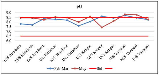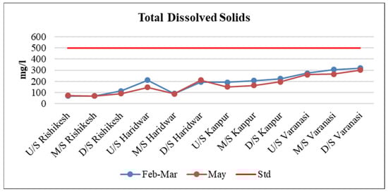 TDS was found in increasing amounts from Rishikesh towards Varanasi, except midstream of Haridwar, which is an indication of the mixing of either municipal or industrial untreated wastewater (Table 3 and Figure 5). In Kanpur, TDS was recorded in increasing amounts. This was mainly due to the joining of municipal and industrial wastewater through the small channels (Figure 5). In Varanasi, TDS was also observed in increasing amounts, especially downstream of Varanasi, where it reaches its higher concentration, which was mainly due to the joining of the Varuna River, which carries all types of wastewater, like treated and untreated sewage and industrial effluent of Varanasi city.