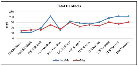 The average dissolved oxygen (DO) levels ranged from 6.4 ± 1.3 to 8.7 ± 1.3. DO levels were lower downstream of Rishikesh compared to those upstream and midstream, primarily due to impounding activity. The results indicate that, in Varanasi, the DO levels were below the standard limit (5.0 mg/L) in May midstream and downstream in both studied months (Figure 6). This could be due to the adjoining of various drains and the Varuna River, suggesting that the river water is not suitable for bathing. The average pH value was observed from 8.2 ± 0.3 to 8.5 ± 0.3 in all four cities (Table 3). The pH was recorded between 7.60 and 8.78 in our study in February–March and May 2023 at all sampling stations. The pH was observed to be slightly higher than the standard limit by the CPCB 1979 (6.5–8.5) in May, as compared to that of February and March (Figure 7). COD is a helpful test to assess pollution in water bodies and was analyzed from February to March. The results confirmed an increasing trend in all case study areas, particularly in Varanasi and Kanpur (Figure 8). Alkalinity was recorded between 60 and 220 mg/L in February and March and from 40 to 180 mg/L in May (Figure 9). It also shows increasing trends in all case study areas in both months. BOD was recorded below the limit in all sites of Rishikesh and Haridwar in both seasons (Table 3). The average value of BOD of each of the cities from upstream to downstream ranged from 1.1 ± 0.6 to 42.7 ± 29.8, which was 2 to 25 times higher than the standard limit of 3.0 mg/L in Kanpur and Varanasi (Figure 10). The observed results represent the influence of organic impurities derived through municipal and industrial wastewater. The observed increasing trend of TH (total hardness) was very similar to that seen in TDS from Rishikesh to Varanasi (Figure 11).