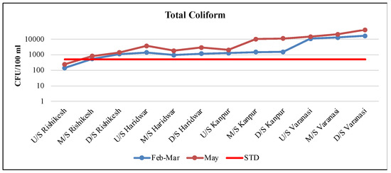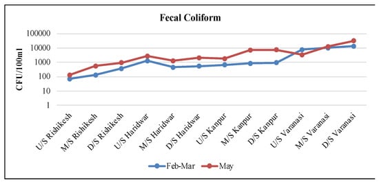 Coliform bacteria indicate the presence of disease-causing organisms in water (sanitary quality of food and water). In this study, the average value of total coliform and fecal coliform colonies in each city ranged from 703 ± 491 to 18,883 ± 10,504 and 365 ± 333 to 13,233 ± 9913, respectively. The total coliform and fecal coliform colony counts were observed as an increasing trend. The total coliform counts of bacteria (Figure 12) were under the permissible limit (500 CFU/100 mL) only at the site upstream of Rishikesh in both study months. The presence of fecal coliform bacteria, or E. coli, hints that water has been contaminated with fecal waste, which may also carry other bacteria, viruses, or parasites like Giardia, which is the cause of beaver fever. Similar to the total coliform count, fecal coliform was also found as an increasing trend (Figure 13).