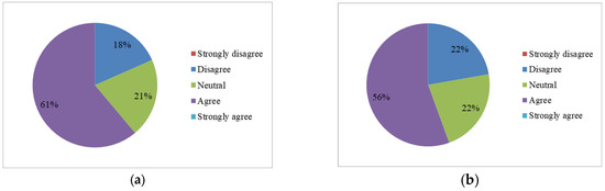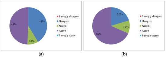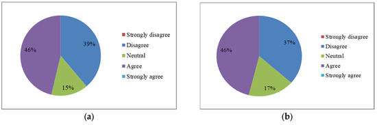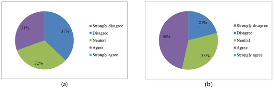 A higher percentage of tourists (37%) are affected by this pollution than the locals (19%), which is quite perplexing, as the city is not a tourist destination, and no logical explanation could be found for it. Tourists’ perception about the water quality in the last ten years matches that of the locals’ perception, in that it increased from moderate to severe. The government programs, such as Namami Ganage, are not dealing with pollution effectively. Despite the 59% that either agree or strongly agree with these programs and strategies, they appear to be failing, despite 59% of tourist thinking that they are working effectively. A high percentage (56%) of tourists (Figure 16b) think that the Ganges in Kanpur is polluted, almost matching the perception of the locals, at 61%. Clearly, a majority of both locals and tourists perceive the Ganges in Kanpur as being polluted, but they do not feel affected by it. It is likely that the Ganges water is not used by those who responded to our survey.