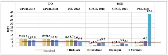 There are several factors that generate physical riverine vulnerability, such as mass religious gatherings. Kumbh Mela, a significant Hindu religious festival and one of the world’s largest, result in a substantial amount of waste, including fecal matter, that ultimately contaminates the river [78,79]. This leads to elevated levels of coliform bacteria, ammonia, BOD, and turbidity [80]. The most recent Kumbh Mela, held in 2013, lasted over 50 days and drew nearly 120 million participants [81]. Khant et al. [82] assessed the water quality of the Jamuna River in Bangladesh at five locations. Their findings, similar to ours, have revealed that levels of dissolved oxygen (DO), pH, turbidity, ammonia, nitrate, sulfate, chloride, calcium, biological oxygen demand (BOD5), chemical oxygen demand (COD), and temperature surpassed the permissible limits across both seasons. Wang et al. (2024) [83] conducted a critical analysis of global water pollution, revealing that it significantly exacerbates water scarcity in more than 2000 sub-basins around the world. These findings underscore the need for immediate action to address the intertwined issues of water quality and availability.