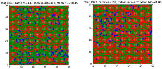Snapshot illustration of grid-based environment with nature, urban and family cells in 1849 and 1929 (Red = urban areas; green = natural areas; blue = families).