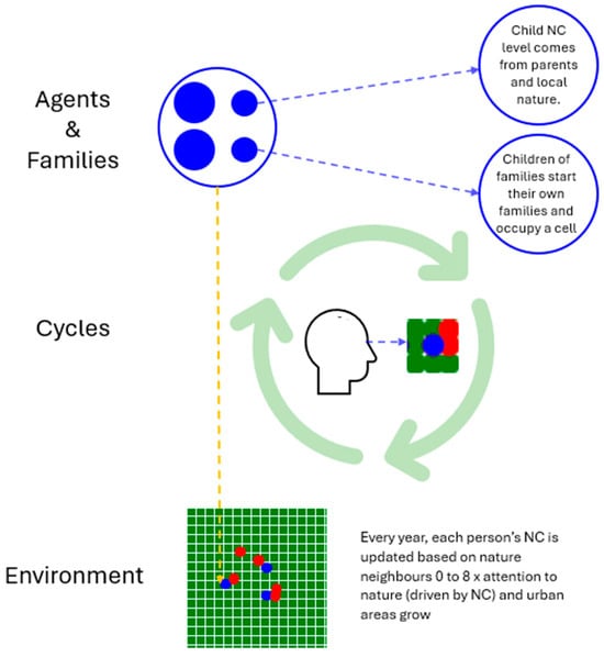 The model employs a grid-based spatial representation where cells correspond to environmental states: nature, urban, or degraded (to reflect post 1970 biodiversity loss). Families occupy urban cells and evolve through individual life cycles, reproduction, and migration. Environmental transitions occur as urban areas expand and nature degrades, with nature connectedness values influencing agents’ attention to natural surroundings.