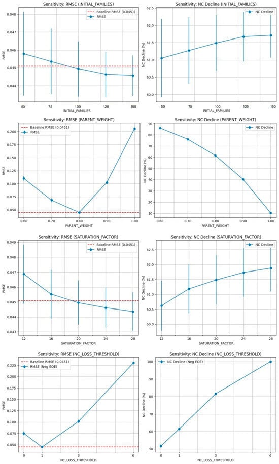 Finally, the initial families parameter had a minimal effect on the model’s overall fit and the extent of nature connectedness decline. Across the range of initial family counts tested, the RMSE and percentage of nature connectedness decline remained largely consistent, suggesting that the initial number of families does not substantially alter the long-term dynamics.