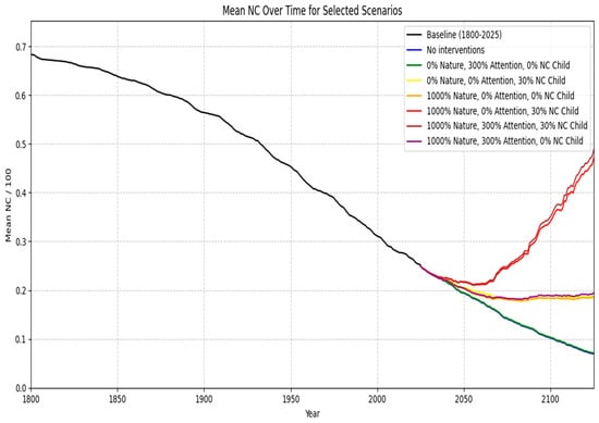 In the first cluster—continued decline—scenarios involving increases in attention to nature or lower-level increases in nature access (50% and 100%) show mean nature connectedness continuing its historical downward trend (green and blue lines). These interventions, whether implemented alone or in combination, are insufficient to reverse the decline.