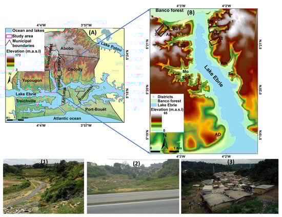Location map of the study area in central Abidjan, on a background digital elevation model (DEM). (A) The pink rectangle indicates the position of Attecoube within the city. (B) Location of districts and main valleys investigated in the study area. Av, Agban-village. CF, Cite Fairmont. SM, Sanctuaire Marial. Bo, Bobito. Bor, Boribana. Se, Sebroko. Ba1, Banco1. AA, Agban-Attié. Ne, Nematoulaye. DE, Djene-Ecare. Mo, Mossikro. Sa 3, Sante 3. AD, Abobo-Doume. The numbers 1, 2, and 3 in Figure 1B represent main valley respectively pictures 1, 2 & 3.