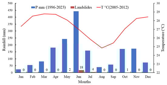 Hydrologically, the main U-shaped valleys are occupied by perennial streams that flow directly into Lake Ebrie, whereas their tributaries exhibit ephemeral flow. Attecoube has a humid tropical climate with two humid seasons (the main one from May to July, and a minor one from October to November) and two dry seasons (August to September and December to March) and is classified as Aw (tropical savannah climate) in the Köppen–Geiger classification [30,31]. The rainfall seasons are largely controlled by the movement of the tropical rain belt associated with the Intertropical Convergence Zone (ITCZ), which oscillates between the northern and southern tropics throughout the year. Monthly rainfall data for the study area are available only for the 1981–2012 period. Moreover, average values cannot represent their high interannual variability. The most humid months are May and June, each with an average rainfall of more than 350 mm, during which the LS hazard is high (Figure 2). Temperatures generally range between 25 °C and 29 °C.