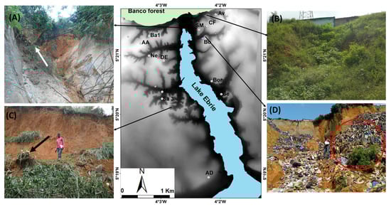 In the eastern half, the relief is characterized by two main, steep-sided, W-flowing, U-shaped valleys that deeply incise the low plateau, exhibiting geomorphological evidence of active slope processes. These valleys’ transverse sections are asymmetric, with steeper N-facing slopes. Especially in the north, where the plateau reaches its highest altitudes, the part of the study area west of the lake is also characterized by deeply incised ravines and valleys, albeit with a more dendritic pattern (Figure 1, pictures 1–3). Although this makes the sector less suitable for urban development than Abobo-Doume to the south, urban sprawl has completely invaded it, with poorly built houses and precarious dwellings set in every imaginable location.