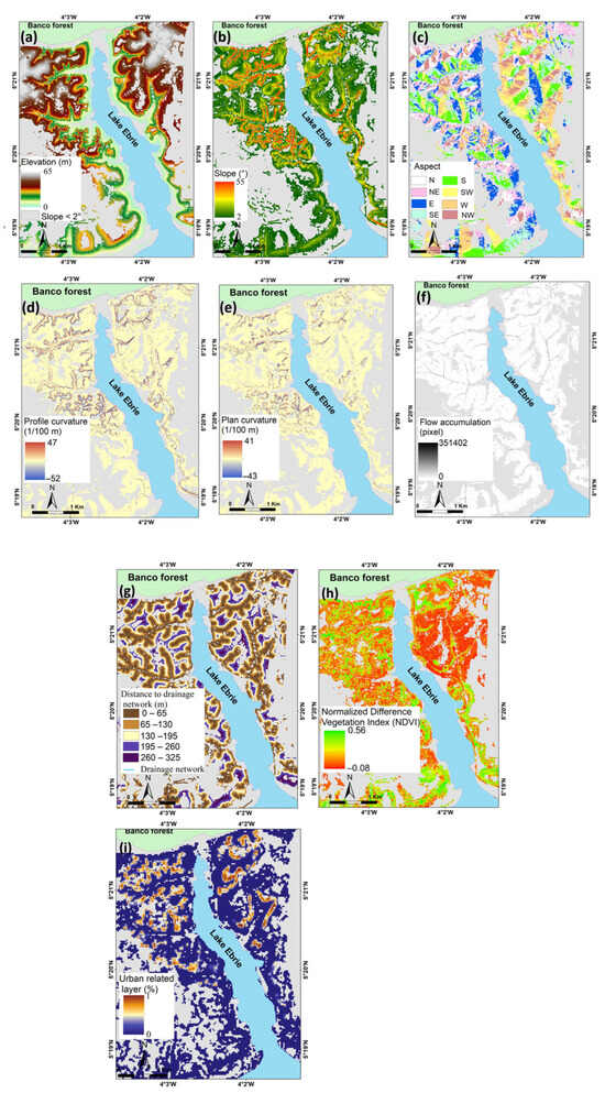 Estimating the probability of landslide (LS) occurrence requires the careful selection of relevant environmental factors. However, there are currently no universally accepted guidelines for identifying these influencing parameters. In this study, factor selection was guided by three main criteria: data availability, the typology of landslides observed, and findings from previous research [41]. Based on these considerations, nine primary factors were selected as input variables: altitude, slope, aspect, profile curvature, plan curvature, flow accumulation, distance to drainage networks, the normalized difference vegetation index (NDVI), and an urban-related layer (Table 3).