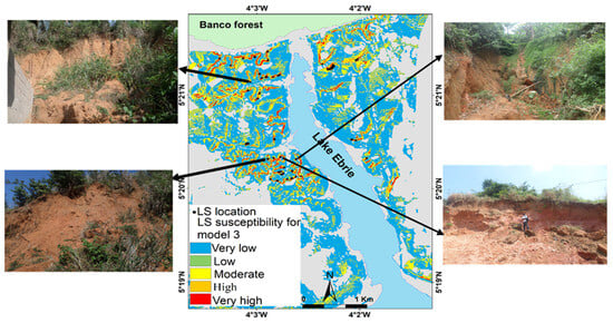 In this study, the results showed that the most susceptible class of the aspect factor was the northwest (), followed by the south () and southeast () classes. This may be due to the prevailing wind direction coming from the south and southeast (Greater Abidjan). These hillslopes, exposed to the wind during the rainy season, receive rainfall that infiltrates the clayed sand units. This water infiltration reduces the shear strength of this formation and triggers a LS. Regarding the slope, our results revealed that slope angle plays a role in the occurrence of LSs in the study area. The frequency distribution of LSs shows that slopes above 5° are potentially subject to landsliding. This is consistent with results found in other tropical regions [62]. However, our results do not align with those of [63]. Those authors reported that, at a constant altitude, the probability of LS occurrence increased, then decreased with the increasing slope, reaching its maximum between 28° and 50°. These findings were confirmed by the work of [64], who indicated that the probability of LS increased with the slope, but decreased with slopes greater than 70°. We note that the altitude variable has a minor influence on the occurrence of LS in this urbanized area, as its odds ratio () is close to unity. The interelationship between LSs and altitude is more pronouced at elevations ranging from 20 m.a.s.l to 40 m.a.s.l. The weak association of LSs with altitude has been investigated in previous studies. For example, Van Den Eeckhaut et al. [65] used a “rare event logistic regression” model to assess LS susceptibility prediction in W Belgium (altitude ranging from 10 m.a.s.l to 150 m.a.s.l) and stressed that terrain height had a relatively minor influence, with an odds value estimated at ().