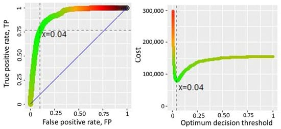 In a binary classification problem, the input vectors (variables) are X = {x1, …, xm} with xi ∈ Rd, and the landslide classes are Y = {y1, …, ym} with yi ∈ {0, 1}. Here, xi is the i-th value of the variable described by dimension d, yi = 1 represents the class of events, and yi = 0 represents the class of non-events. In this scenario, each event/non-event pixel i is associated with a specific cost Ci. For example, for correctly classified pixels, i.e., true negatives and true positives, the associated costs are CTN and CTP, respectively. Furthermore, the costs associated with model-induced misclassification of pixels are the cost of false negatives (CFN) and the cost of false positives (CFP), respectively. [54]. In general, the costs associated with CTN and CTP equal zero. Therefore, for the classifier hi (x) (here, the decision threshold), the total expected cost based on this cost matrix is given by the following expression: