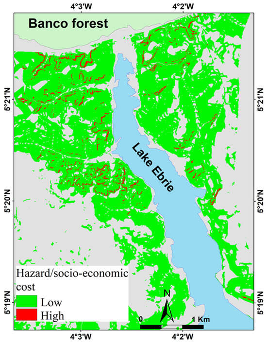 The increase in stable zones (FN) coupled with the reduction in unstable zones (FP) constitutes a significant housing problem in the study area (Table 11). Unstable areas, characterized by high economic costs, are concentrated on the upper parts of the hillslopes. To a certain extent, these areas, which are considered dangerous, are unsuitable or even unfit for construction. The current planning regulations adopted by the Attecoube municipal authorities (and, indeed, the Ivorian government) are very close to this situation. In this context, residents reported the destruction of several buildings at the top of the hillslopes during our fieldwork. This was linked to the recurrent occurrence of mass movements with their attendant loss of life and injuries. Stable zones with low economic costs occupy a significant proportion of the study area (talwegs, slopes, and hilltops). Analysis of the costs associated with misclassification reveals that the probability of committing a type II error (false negative rate) is almost three times higher than that of committing a type I error (false positive rate). Given the evolution of the hillslopes in this urban area, except for the gentle slopes (talwegs, tops of slopes, around the bay lagoon), the other slopes can be assumed to be hazardous. It is, therefore, essential to recommend preventive measures to stabilize hillslopes, especially as human activities and the effects of climate change have adverse consequences on the balance of slopes in urban areas.
